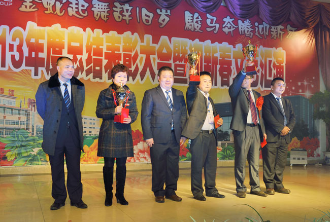 集团董事、副总裁刘沁宣读了在2013年工作中做出突出贡献的先进单位、先进集体、先进个人、优秀营销团队、优秀共产党员、员工成长奖、董事长特别奖获奖名单。集团董事、集团领导和各公司领导为他们颁发了奖杯、证书和奖金。